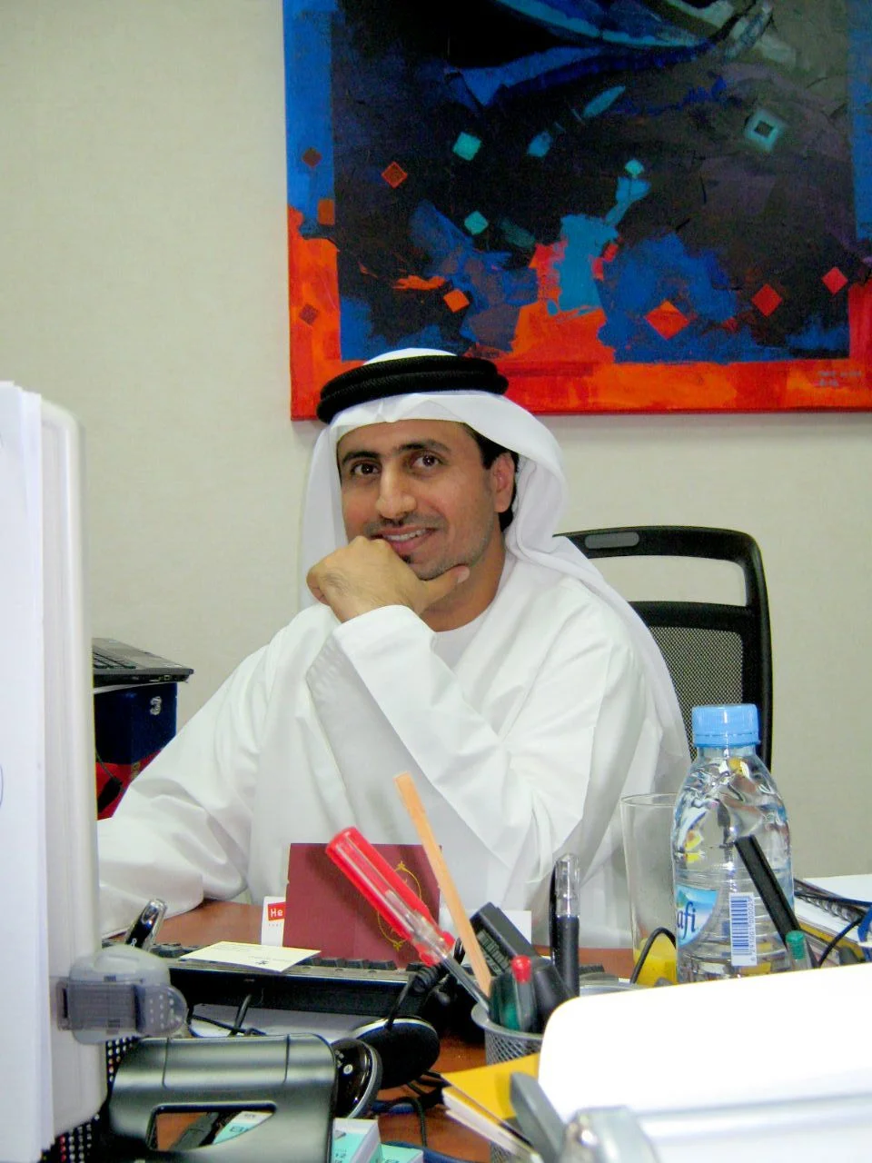 Khalil Abdul Wahid at his desk in Dubai Culture. Behind artwork by Musab Abul Qader Al Rais. Collection of Khalil's. 2011.