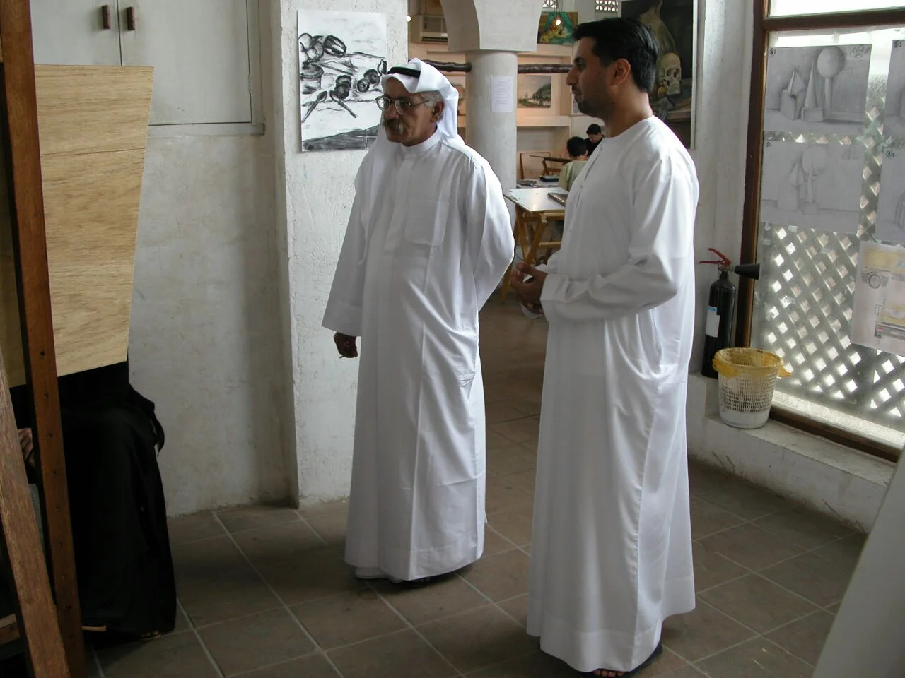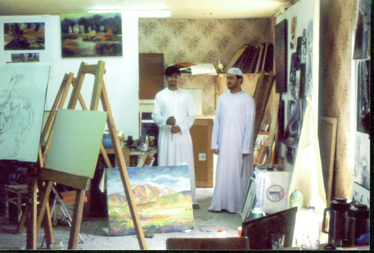 Khalil and Hassan Sharif around 2000 at Bait Alserkal in Sharjah. Hassan was visiting the summer workshop taught by Khalil and Mohammed Kazem. Photo courtesy of Khalil Abdul Wahid